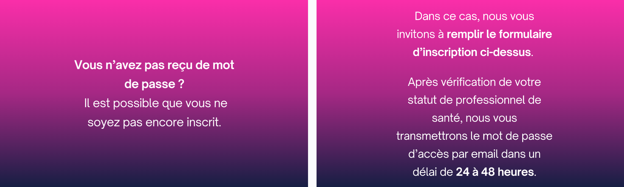 Après vérification de votre statut de professionnel de santé, nous vous transmettrons le mot de passe d’accès par email dans un délai de 24 à 48 heures.